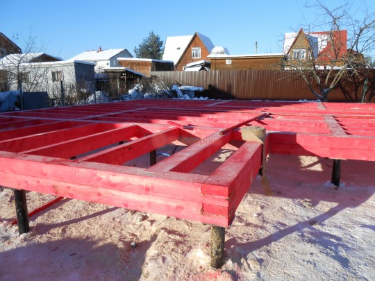 Могли бы просто прибивать брусины друг к другу, но запариваемся на сверление под каждый гвоздь, чтобы минимизировать последствия усадки.