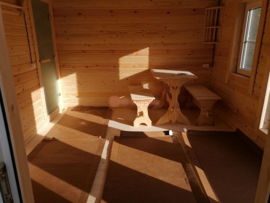 В комплект бани входит стол и две скамейки из доски 19мм, как на фото. Есть комплекты из более толстой доски а также из кедра, смотрите в доп комплектации.
