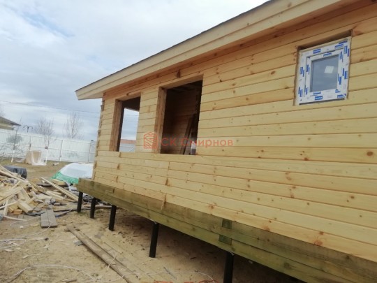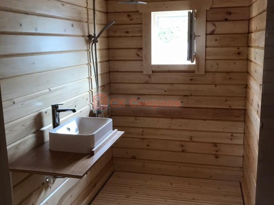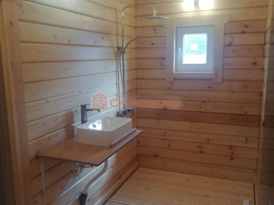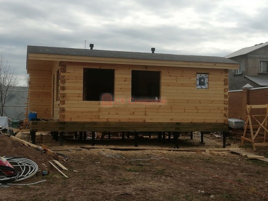 Такая одноэтажная баня 5.3х8 может быть построена из бруса. Ориентировочный срок строительства 31 дней.