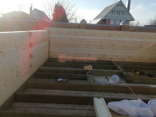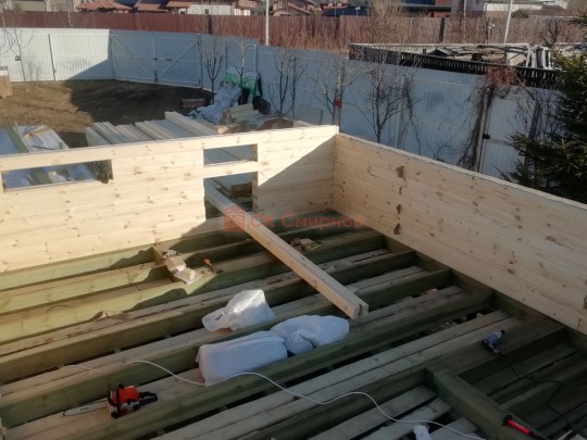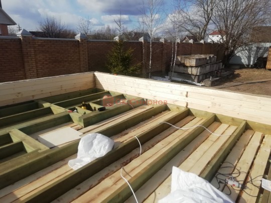 Лаги, обвязку и черновой пол обрабатываем раствором био огне защитой ( зимой оговариваются отдельные условия ), в основном красный цвет, но может быть и бесцветная обработка.