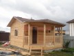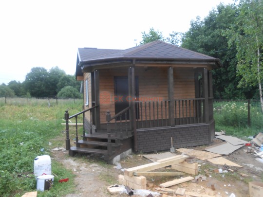 Терраса необычайно привлекательной формы дает своему обладателю широкий спектр возможностей: здесь можно установить небольшой мангал и садовую мебель, для полноценного отдыха между принятиями банных процедур. Для вечерних посиделок террасу можно украсить цветами и небольшой прозрачной гардиной, таким образом, вы создадите великолепный уголок, в котором можно будет послушать пение птиц или стрекотание кузнечика.