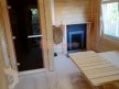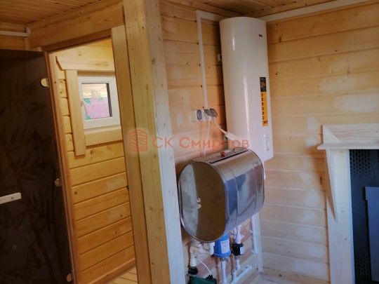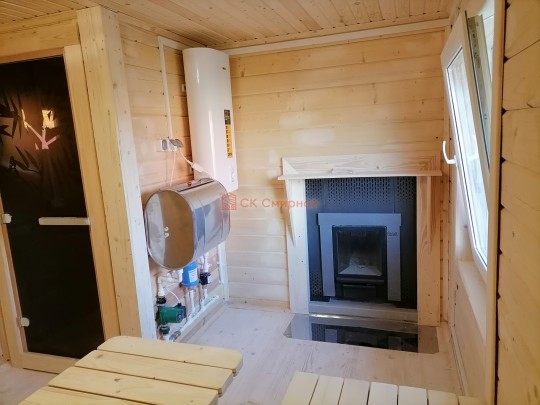 Строение одноэтажное, но с чердаком (он не жилой, но может использоваться для хранения) — подняться можно с террасы по приставной лестнице. Баня размером 3 на 8 метров. Внутри 3 помещения: комната отдыха, парная и душ. Установлена независимая душевая система с бойлером и насосом. Проектом предусмотрена печь с выносной топкой через стену. Каменка остаётся в парной, а топить нужно из комнаты отдыха. Это удобно.