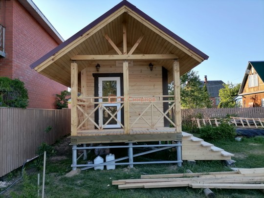 Очень удачный проект классической одноэтажной бани с двускатной крышей и террасой перед входом. На фотографиях и видео банька, которую мы построили в начале лета 2021. Это пример того, что может получиться из весьма простого проекта.