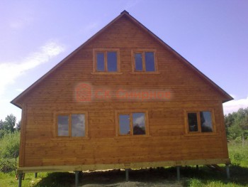 Из профилированного сухого бруса 9х14см, 14х14 см или 14х19 см. Сборка сруба в теплый угол на нагеля или гвозди 200 мм со сверлением отверстия в верхнем брусе (в зависимости от вида бруса).