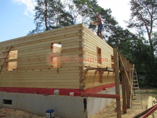 Из профилированного сухого бруса 9х14см, 14х14 см или 14х19 см. Сборка сруба в теплый угол на нагеля или гвозди 200 мм со сверлением отверстия в верхнем брусе (в зависимости от вида бруса).