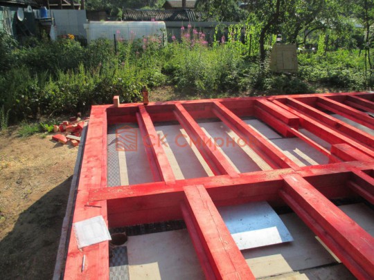 Лаги, обвязку и черновой пол обрабатываем раствором био огне защитой ( зимой оговариваются отдельные условия ), в основном красный цвет, но может быть и бесцветная обработка.