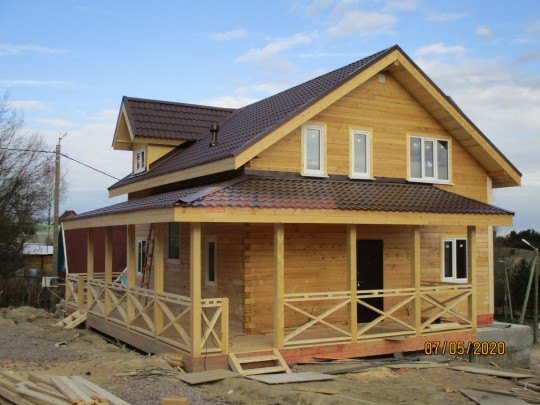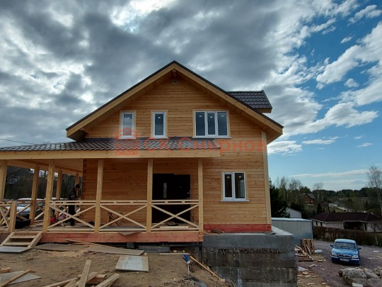 Из профилированного клееного бруса 9х14см, 14х14 см или 14х19 см. Сборка сруба в теплый угол на нагеля или гвозди 200 мм со сверлением отверстия в верхнем брусе (в зависимости от вида бруса).