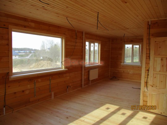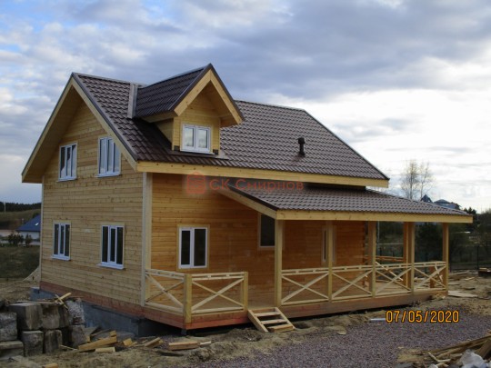 Из профилированного сухого бруса 9х14см, 14х14 см или 14х19 см. Сборка сруба в теплый угол на нагеля или гвозди 200 мм со сверлением отверстия в верхнем брусе (в зависимости от вида бруса).