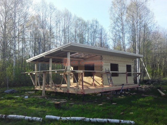 Из профилированного сухого бруса 9х14см, 14х14 см или 14х19 см. Сборка сруба в теплый угол на нагеля или гвозди 200 мм со сверлением отверстия в верхнем брусе (в зависимости от вида бруса).