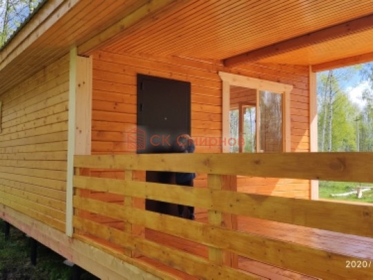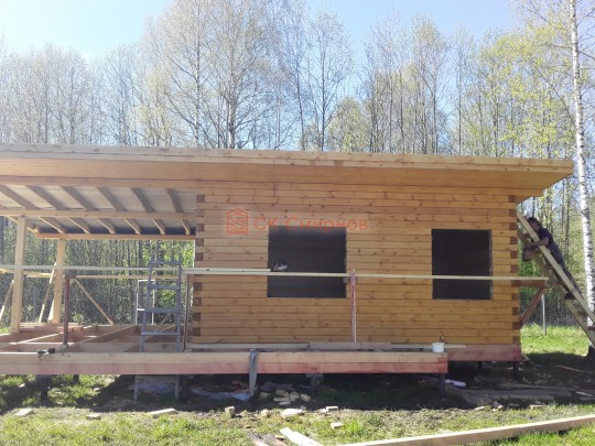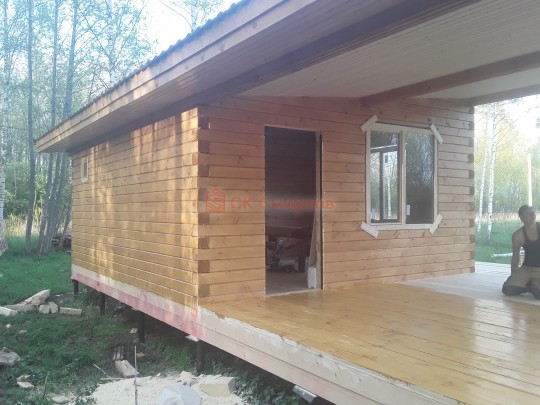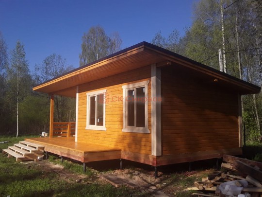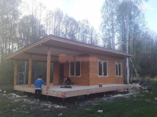 Из профилированного клееного бруса 9х14см, 14х14 см или 14х19 см. Сборка сруба в теплый угол на нагеля или гвозди 200 мм со сверлением отверстия в верхнем брусе (в зависимости от вида бруса).