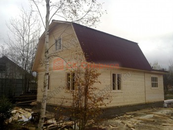 Из профилированного сухого бруса 9х14см, 14х14 см или 14х19 см. Сборка сруба в теплый угол на нагеля или гвозди 200 мм со сверлением отверстия в верхнем брусе (в зависимости от вида бруса).