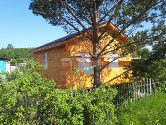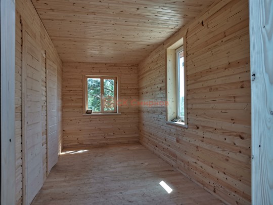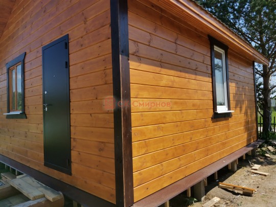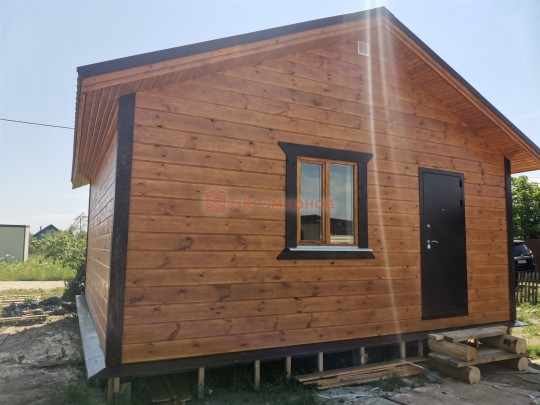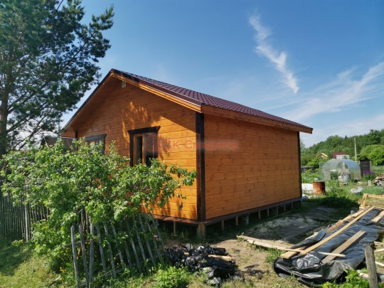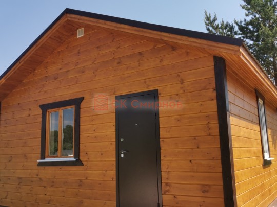 Это одноэтажная дача 6 на 6 с нежилым чердаком (лестницы нет). Пространство внутри разделено на 3 помещения. В основе лежит брусовой каркас, который снаружи обшит имитацией бруса 20х190, а изнутри сортовой вагонкой. Двускатная крыша покрыта хорошей металлочерепицей GrandLine с полимерным напылением. Изначально ставили деревянные стеклопакеты, но в ходе строительства клиент поменял решение и привёз свои пластиковые окна. Входная дверь Аргус 9.